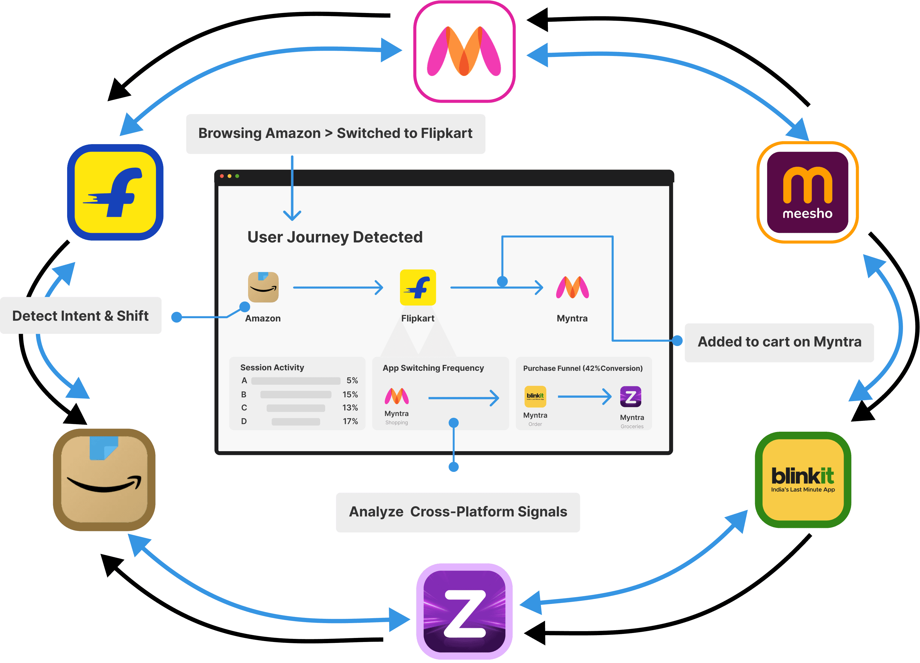 See how users travel between Amazon, Flipkart, Myntra, Nykaa, and other apps and the actual actions users take within applications. From browsing patterns and search behavior to product exposures and add-to-cart activity, every interaction helps decode the complete user behaviour trends.